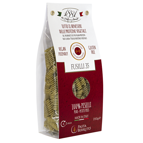 I nostri FUSILLI AI PISELLI | N° 35 della Collezione 1881 by Stefano Berruto sono una novità e rappresentano un'ottima scelta completamente senza glutine, ideale per la dieta celiaca e per coloro che desiderano variare il loro pasto con un gusto nuovo. Inoltre questo prodotto ha un altissimo tenore proteico e quindi sono una fonte naturale di proteine vegetali. Le proteine contribuiscono al mantenimento della massa muscolare. Per cui possiamo dire che sono speciali soprattutto per tre motivi: