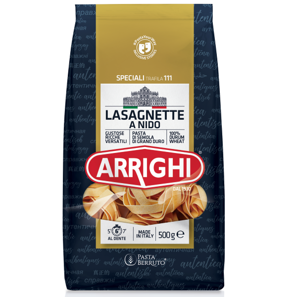 Le nostre LASAGNETTE A NIDO | N°111 fanno parte della grande selezione di Pasta ARRIGHI prodotta solo ed esclusivamente con semola di grano duro. Dalla sfoglia larga, piatta e corposa, le nostre Lasagnette sono capaci di trasformare ogni tuo piatto perfetto per un'occasione speciale.