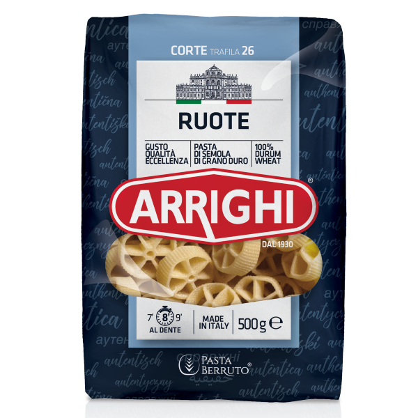 Le nostre RUOTE | N°26 fanno parte della grande selezione di Pasta ARRIGHI prodotta solo ed esclusivamente con semola di grano duro. Le forme e le geometrie le rendono speciali perché sono ispirate al mondo della meccanica e dell’industria automobilistica. Sono molto amate dai più piccoli, portano in tavola un tocco di allegria e brio.