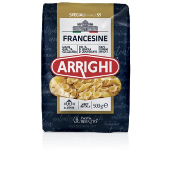 Le nostre FRANCESINE | N°59 fanno parte della grande selezione di Pasta ARRIGHI prodotta solo ed esclusivamente con semola di grano duro. Sono più piccole delle Farfalle e hanno le ali arrotondate. Conservano le stesse caratteristiche delle Farfalle perché hanno le ali morbide che contrastano con il cuore tenace, garantendo una sensazione al palato di alternanza di sapori e consistenze.