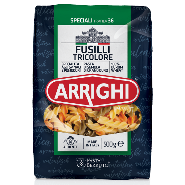 I nostri FUSILLI TRICOLORE | N°37 fanno parte della grande selezione di Pasta ARRIGHI prodotta solo ed esclusivamente con semola di grano duro, spinaci e pomodori.  Sono ideali con sughi di verdure o a base di carne o cremosi con ricotta. Con questi Fusilli farai sempre un figurone: valorizzano i sughi più elaborati e densi, ma anche quelli più semplici, e consentono grandi risultati anche se si vuole osare qualche difficile esperimento culinario. Sono certamente un formato di pasta patriottico con l'aggiunta di due semplici ingredienti: spinaci e pomodoro.